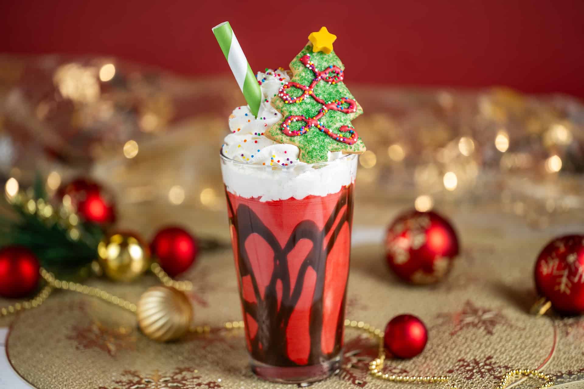 - Red Velvet Holiday Milk Shake: Red velvet milkshake swirled with chocolate sauce and topped with whipped cream, rainbow sprinkles, and a holiday tree sugar cookie