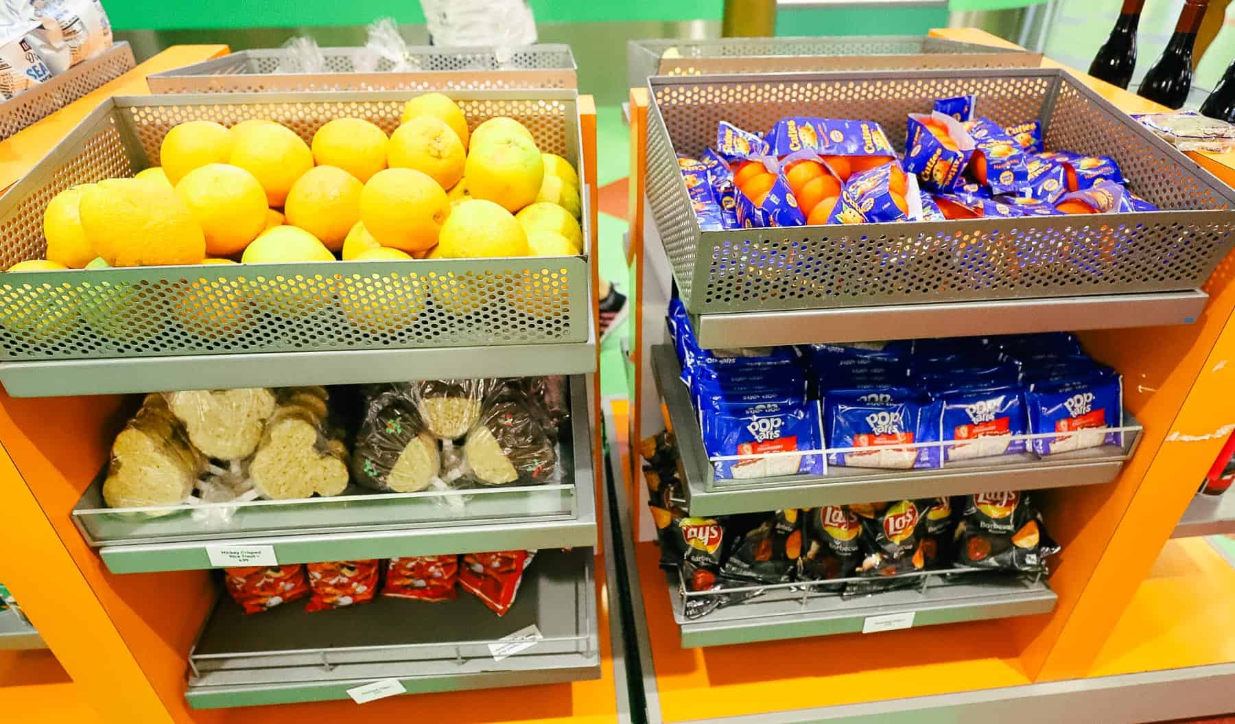Here, we have a few fruits (oranges and Cuties), crispy rice treats, Pop-Tarts, and bags of chips.